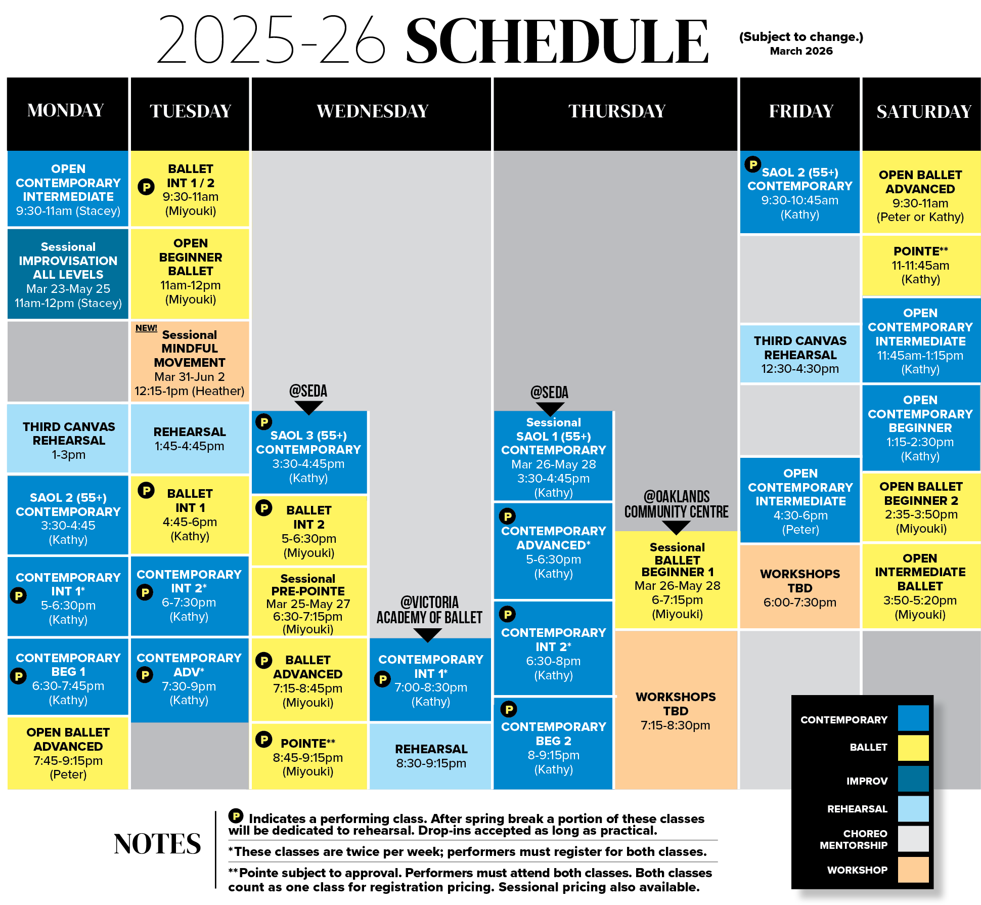 Classes labelled as “Performance” are a 10 month progressive course, and move into creation for our live performance at the year end show the week of June 17-21st. “Open” classes are non-performance and remain drop in friendly all year.
